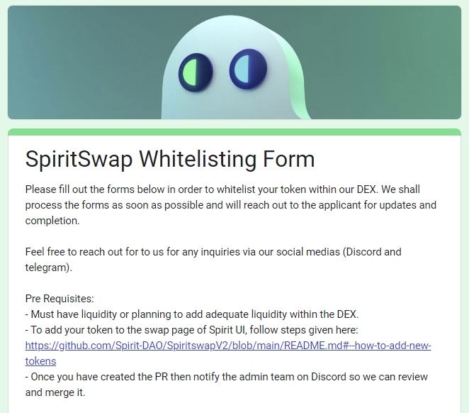 This section will be the guide to everything related to apply for whitelisting within SpiritSwap DEX.