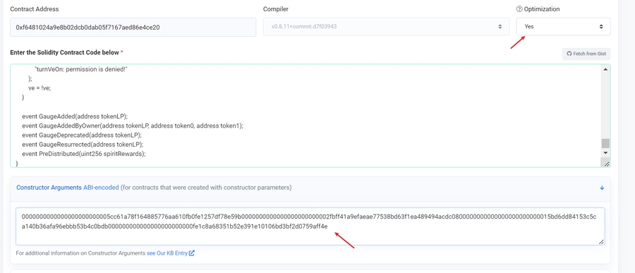 5) Once encoded, copy the value without the 0x in-front of it. and put it on ftmscan verification step. Select 'Optimization' as Yes on top right. Put the encoded value in the box.