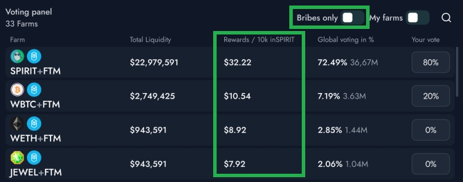 Each week, inSPIRIT holders can review all bribes available within the inSPIRIT tab prior to voting on the weekly gauge emissions. Currently this is displayed by calculating the value of each bribe per 10,000 inSPIRIT held.
