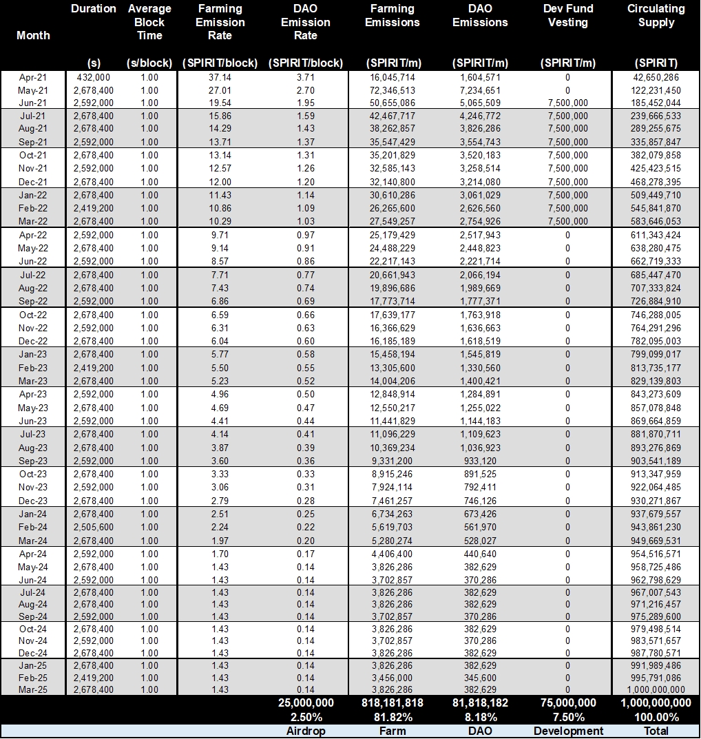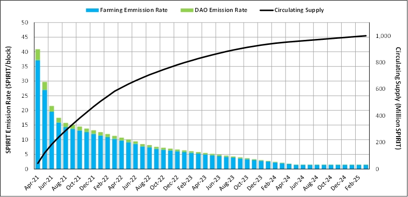 Farm / Gauge emissions: Are governed through inSPIRIT holders by way of gauge control. While the emission allocation to Farms / "Gauges" are constant as per the diagram below, it is inSPIRIT holders who decide which farms receive variable emission allocation weight, each epoch (weekly). DAO emissions: Are sent to the SpiritSwap Multi-Sig wallet, which are then put into an investment strategy decided upon by the Multi-Sig until the funds are required for use. Use of these funds are restricted for activities such as; - Development expenses - Service Contract expenses - Marketing expenses - General operations to maintain the upkeep of the exchange