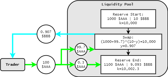 In Figure 1, a trader is swapping $AAA token for $BBB tokens. The trader sends 100 $AAA tokens to the AMM. A 0.18% fee is applied and 0.18 $AAA tokens are not included in the swap. The remaining 99.82 $AAA tokens are swapped in the AMM to $BBB tokens. Since the AMM will be losing $BBB tokens, it must gain $AAA tokens to keep k constant. The equation: