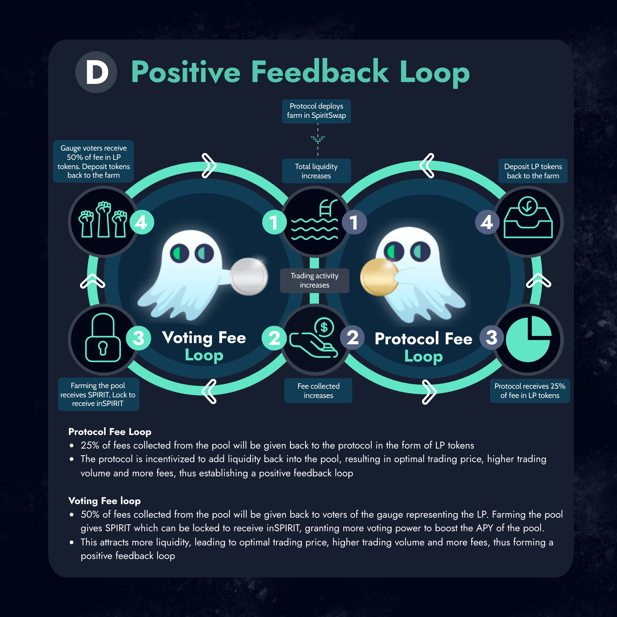 The protocol reward fee model is a rebate to protocols who list LP’s with us, for example Liquid Driver. Out of all fees collected on Liquid Drivers Liquidity pools, 25% of these will be given back to the protocol who lists with us (in this example Liquid Driver). This incentive will be an enticement to new and emerging protocols looking to launch on FTM as well as rewarding those who have maintained loyalty to the SpiritSwap ecosystem from the get go. This fee reward should see SpiritSwap capture a much larger allocation of liquidity provision as this approach offers an extra revenue model for protocols. This incentivizes protocols to add MORE liquidity with SpiritSwap thus deepening liquidity. Deeper liquidity on the exchange means more optimal trade pricing. More optimal trade pricing means more trades going through SpiritSwap routers which in turn means more fees collected. This establishes a positive feedback loop of liquidity provided vs fees collected by the protocol. This positive feedback loop is further supercharged, as the 25% protocol reward fee distributed to each respective protocol could be used as protocol owned liquidity to farm more SPIRIT (given that these rewards are given in the form of LP’s). For example Liquid Drivers Protocol Reward Fee will be in the form of LQDR - FTM SPIRIT LP’s. Liquid driver will likely then use the SPIRIT farmed to lock up for inSPIRIT and use that inSPIRIT to further boost their gauges. This a win for the SpiritSwap ecosystem, a win for the protocols involved and a win for SpiritSwap users (due to deeper liquidity, increased volume and subsequent increase in fees captured). To collect this fee, each protocol who lists with SpiritSwap must reach out to establish a chain of communication and provide a multi-sig controlled wallet to accept this weekly fee. This system also helps add a layer of security for users, as it enables the SpiritSwap development team to establish a dialogue with protocols who are deploying liquidity.