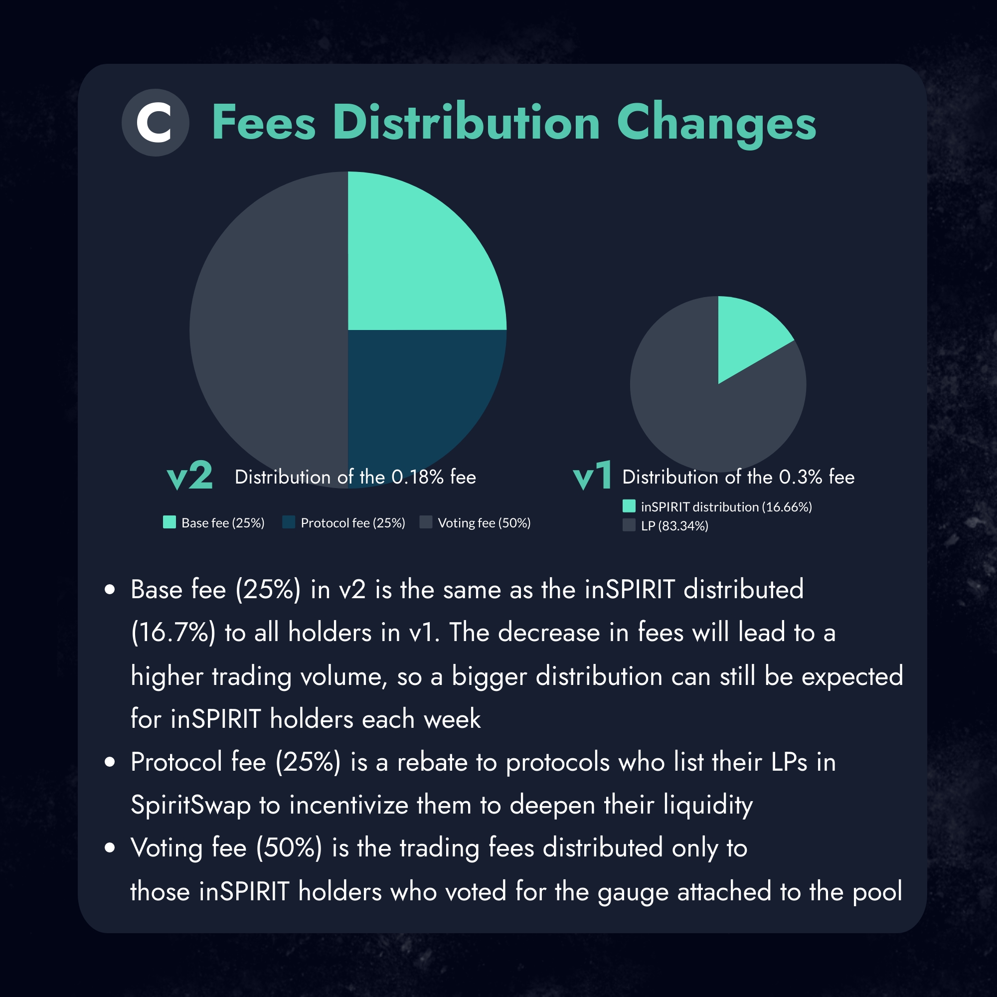 Of the NEW 0.18% fee collected: 25 % will be distributed to “Base Fee” (inSPIRIT holders) 25% will be distributed to "Protocol Fee" 50% will be distributed to "Vote Fee" (inSPIRIT holders gauge specific)